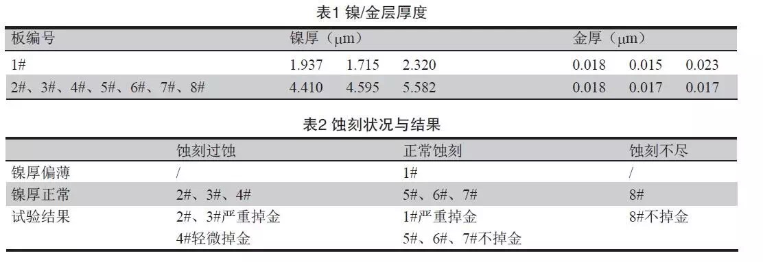 從跟進情況可知,2#、3#、4#存在蝕刻過蝕導致掉金情況;1#由于鎳厚偏薄,導致雖然蝕刻參數(shù)正常,但仍出現(xiàn)嚴重掉金。