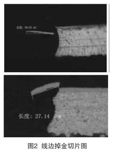 (3)有的線路鎳層厚度在3 μm以上,蝕刻突沿在25 μm以內(nèi),但仍存在線邊掉金現(xiàn)象。