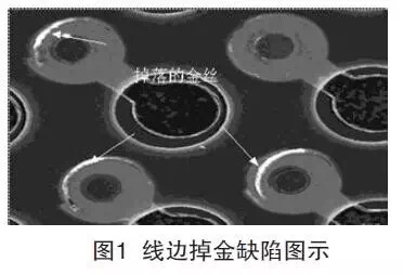 干膜法鍍鎳金板一直存在線邊掉金問題,不良率一直較高,而掉金絲問題過程檢驗難以發(fā)現(xiàn),需要到電測進行開短路測試時才能發(fā)現(xiàn)異常板,如果在電路板廠電測漏測導致不良板流到客戶端進行使用,存在極大安全隱患(圖1)。