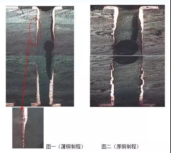 漸薄類型的孔無銅均有一共性,即:孔內(nèi)銅層從孔口至孔中央逐漸減薄,直至銅層消失。具體圖片如下: