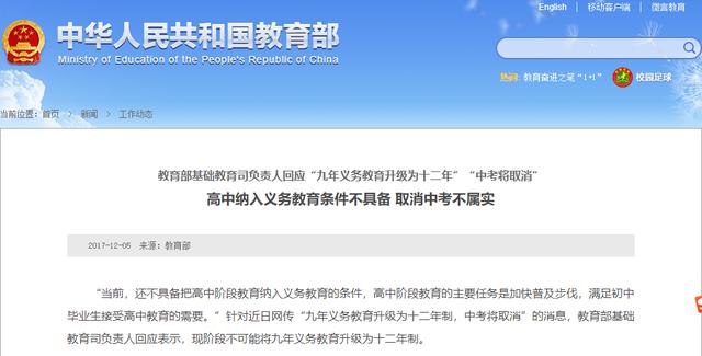 針對取消中考的消息,教育部2017年也曾在其官方網站上辟謠,稱高中納入義務教育條件不具備,取消中考不屬實。