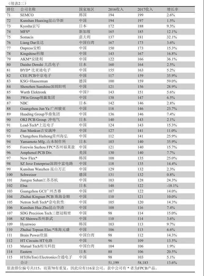 以2017年P(guān)CB銷售額為序,世界頂級PCB制造商的排名見表2。列入此排名表的PCB制造商年度銷售額均在1億美元以上。