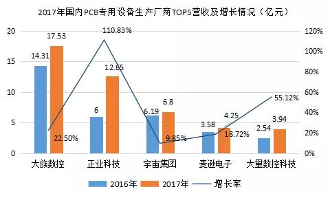 國內PCB專用設備排名第一的是大族數控,是由深圳市大族激光科技股份有限公司組建的全資子公司,開發和生產HANS系列PCB激光設備、PCB數控鉆銑機等印刷電路板行業的專用設備,適用于印刷電路板的精密鉆孔和異形槽、孔、邊 框的銑削加工。2017年營收高達17.53億元,同比增加22.50%;正業科技排名第二,2017年營收為12.65億元,同比增長高達110.83%。整體來說,PCB專用設備/儀器代表公司營收情況較好,市場進入壁壘較高,競爭相對較小。