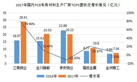 鷹潭江南銅業有限公司作為國內最大規模的電鍍銅材生產基地,專業生產高品質微晶磷銅球、PCB陽極磷銅球、磷銅角、微晶磷銅板、純銅球、純銅角、氧化銅粉及仿金板等系列產品。2017年營收達28.91億元,同比增長79.90%;TOP5廠商中,除承安銅業外,其余營收均有所增加。