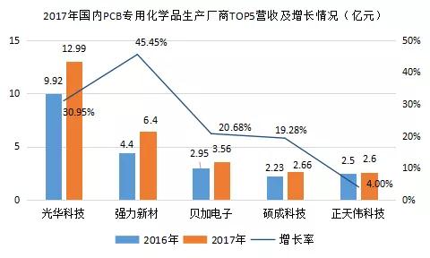 國內PCB專用化學品龍頭生產企業為廣東光華科技股份有限公司,以“高性能電子化學品”、“高品質化學試劑”和“新能源材料”為主導深耕于PCB領域;2017年營收為12.99億元,占比高達30.95%,其中PCB化學品占營收比重超過50%,為58.97%。