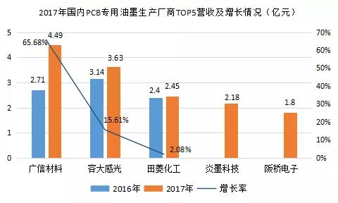 廣信材料作為PCB油墨行業的龍頭企業,牽頭制訂了《印制電路用標記油墨》和《印制電路用阻焊劑》兩項行業重要標準。公司的主打產品阻焊油墨(solder mask)KSM-S6188系列、KSM-180系列產品都已獲得美國UL安全認證。2017年實現營收4.49億元,同比增長65.68%。