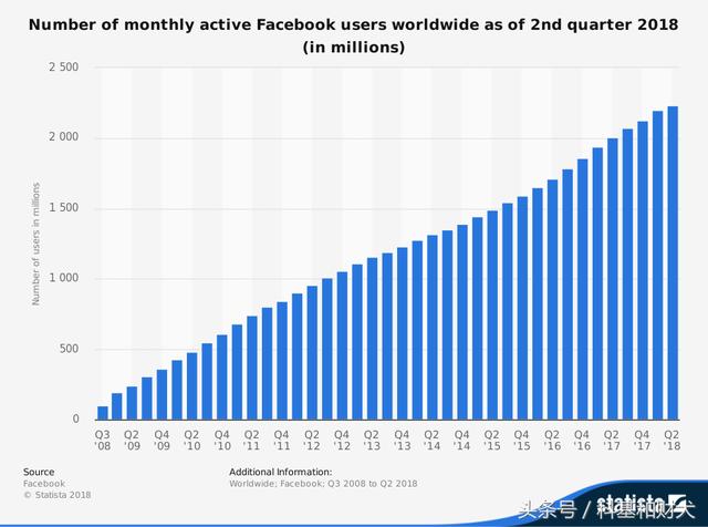 2008年-2018年Facebook每個季度的月活躍用戶數