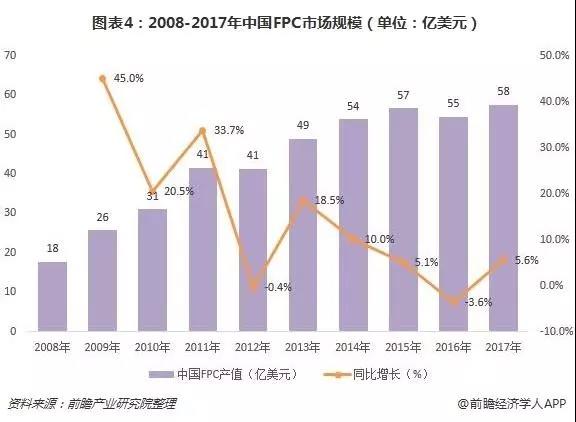 2008-2017年,中國FPC產量整體呈增長趨勢,且占全球FPC產量比重不斷增大。2008年,中國FPC產量為18億美元,經歷了2008-2011年的快速增長期后,中國FPC產量增速開始放緩,2017年中國FPC產量為58億美元。2017年,中國FPC產量占全球的一半以上。整體來看,中國FPC行業發展態勢較好。
