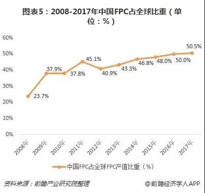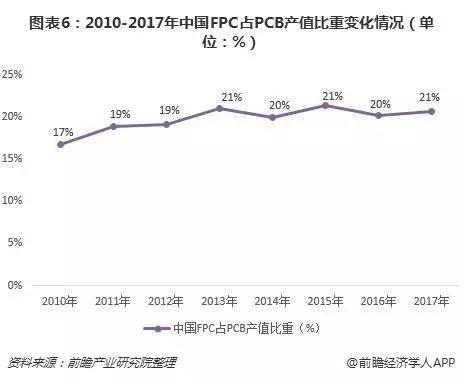 憑借其輕量化、小型化、薄型化的特點,FPC在PCB中脫穎而出。2010-2017年,中國FPC占PCB的比重總17%提升到了21%。