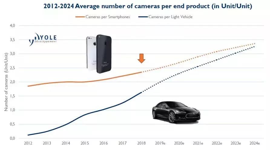 2012~2024年每部手機和每臺汽車中的平均攝像頭數量變化