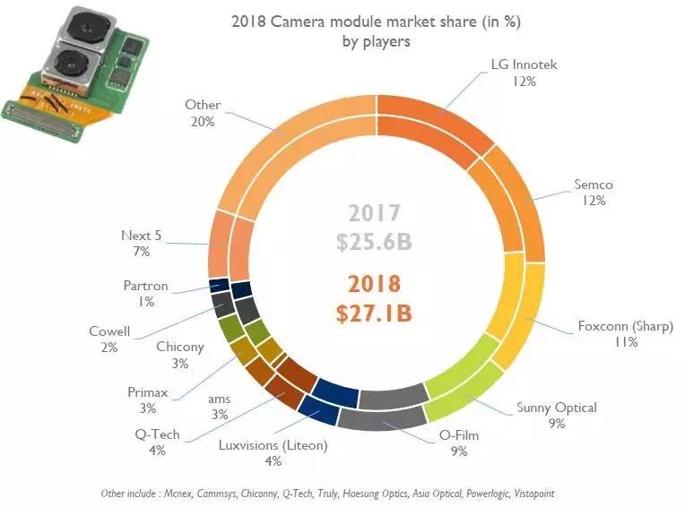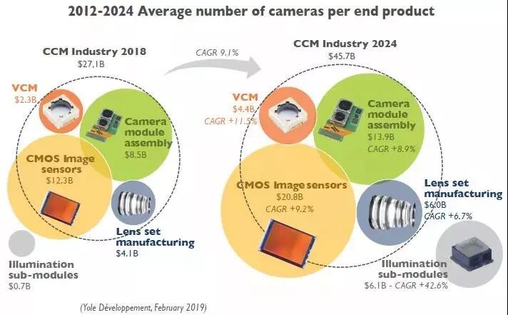 攝像頭模組產業已經發展到了一個新階段,預測2018年全球攝像頭模組市場規模達到271億美元,未來五年將保持9.1%的復合年增長率(CAGR),預計2024年將達到457億美元。該產業的主要驅動因素為智能手機和汽車等產品中的攝像頭數量不斷增加,因此CMOS攝像頭模組市場仍具很強的吸引力。