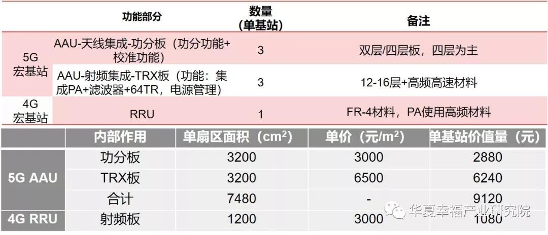 4G時代,基站僅RRU+BBU有PCB需求,5G基站新架構(gòu)及新技術(shù)提升PCB需求量,市場規(guī)模280億元。根據(jù)5G AAU設(shè)備的設(shè)計(jì),每個AAU將包含3塊電路板:1個功分板,1個TRX板。高頻及高速要求線路板層數(shù)增加,尺寸增大,材料要求提升,推升單板價格,5G印刷電路板價值上升。