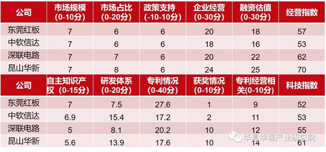 中國PCB廠家全球前100名占據(jù)25席,其中有4家未上市企業(yè),具備制造5G基站高頻PCB的能力,對其經(jīng)營和科技指數(shù)的評分結(jié)果如下表12所示。
