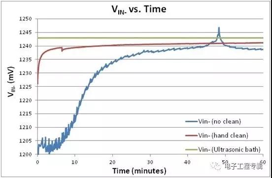 在本次測試中,裝配后我同時記錄了不同程度清潔之后 VIN- 和 VOUT 一小時的變動情況: