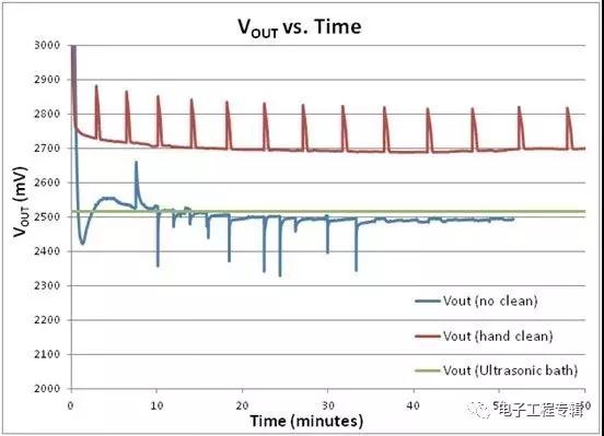 從上圖可以看出,焊劑污染對橋接傳感器輸出性能有嚴重的影響。在未清潔或手工清洗的情況下,橋接傳感器電壓從未達到約 VREF/2 的預期電壓,即便在一小時趨穩時間之后。此外,未清潔電路板還表現出大量外部噪聲收集。在使用超聲波浴清洗并完全干燥后,橋接傳感器電壓穩如磐石。