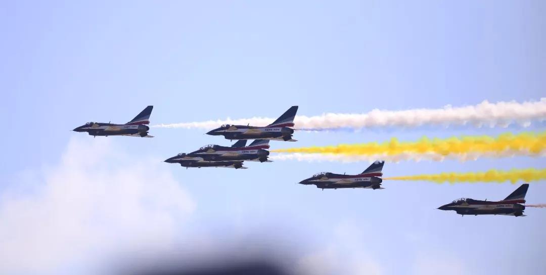 當(dāng)時八一飛行表演隊在殲10上掛載了一個裝有新型液體彩煙劑的大型容器,通過氮氣加壓的方式將煙劑送入發(fā)動機噴出的高溫燃?xì)庵校纬烧羝隼洌瑥亩纬蔁熿F。