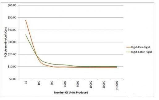圖1:軟硬結合設計和電纜連接的剛性PCB組裝成本比較