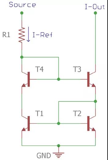 電路需要兩條假設——一是所有的晶體管都有著相同的電流增益,二是T1和T2的集極電流相等,因為T1和T2相匹配且使用的是相同的晶體管。