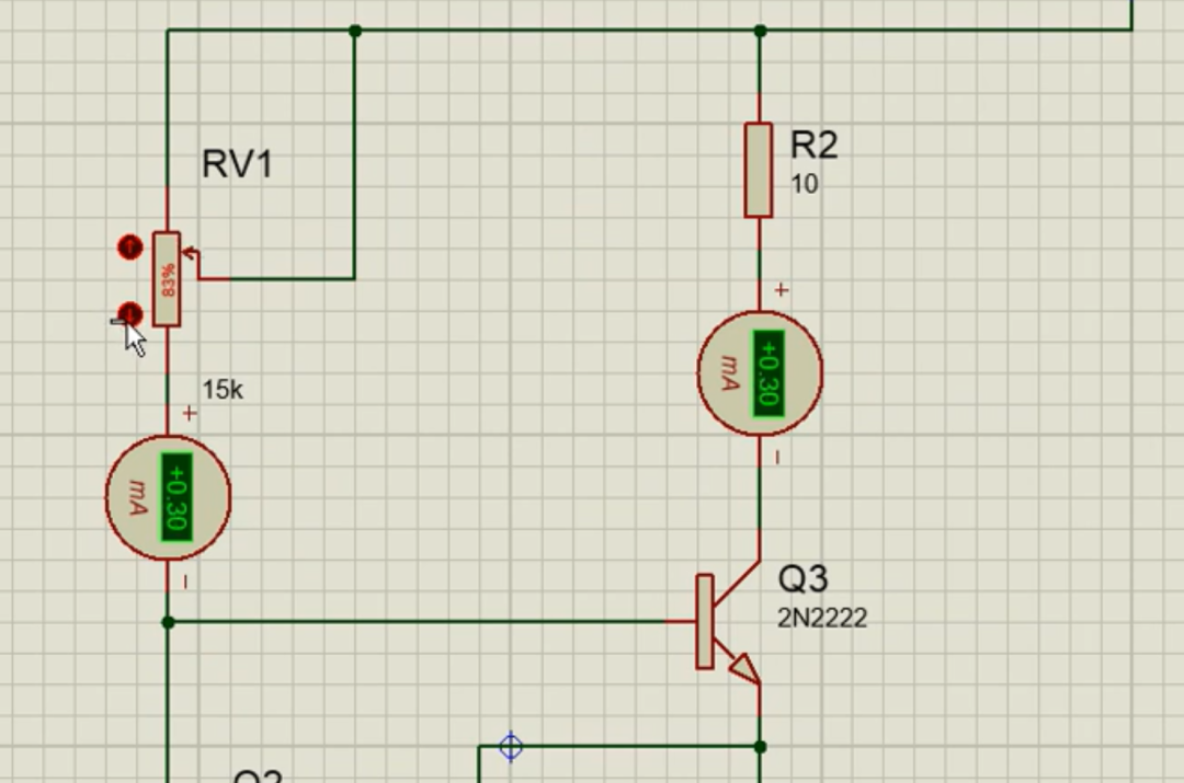 其中選取的BJT皆為相同規格的2N2222。此處的電位計用于改變Q2的集極電流,從而進一步改變了Q3的基極電流,至于輸出負載,此處選取了10Ω的電阻。