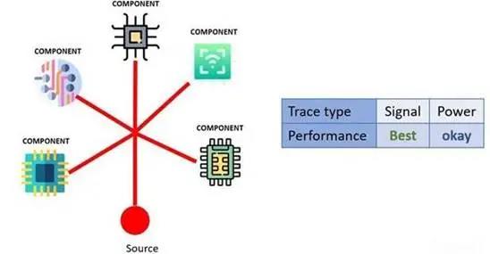 星源可以看作是單點源的改進(jìn)。由于其關(guān)鍵特性,它有所不同:組件之間的走線長度相同。星型連接通常用于帶有各種時鐘的復(fù)雜高速信號板。在高速信號PCB中,信號通常來自邊緣,然后到達(dá)中心。所有信號都可以從中心傳到電路板的任何區(qū)域,并且區(qū)域之間的延遲最小。