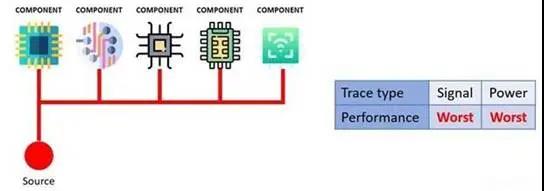 每個組件的電源和地線均彼此分開。所有組件的電源走線僅在單個參考點匯合。單點被認(rèn)為是最適合功率的。但是,對于復(fù)雜或大型/中型項目,這是不可行的。
