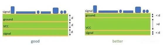 對于高頻設(shè)計(例如RF系統(tǒng)),EMI可能是一個很大的缺點。前面討論的接地層有助于減輕EMI,但是根據(jù)您的PCB,接地層可能會帶來其他問題。在具有四層或更多層的疊層板中,飛機(jī)的距離至關(guān)重要。當(dāng)平面間電容小時,電場將在板上擴(kuò)展。同時,兩個平面之間的阻抗減小,允許返回電流流到信號平面。這將對穿過平面的任何高頻信號產(chǎn)生EMI。