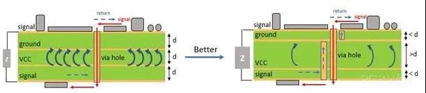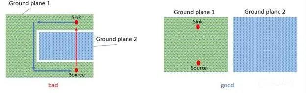 但是,有如下缺點。我們應(yīng)該注意主要是由接地平面的不連續(xù)性造成的分割地面的串?dāng)_和環(huán)路區(qū)域。下圖顯示了兩個分開的接地平面的示例。在左側(cè),返回電流無法沿著信號走線直接通過,因此會出現(xiàn)環(huán)路區(qū)域,而不會在右側(cè)環(huán)路區(qū)域進(jìn)行設(shè)計。