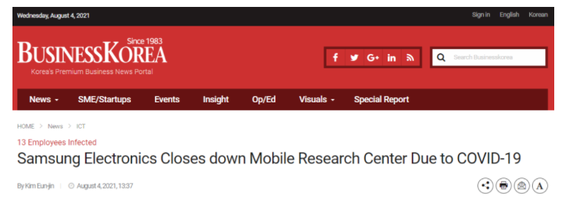 三星電子表示,8月2日在其研究中心R5大樓工作的一名職員被確診后,三星立即關閉大樓,并對100多名密接員工進行核酸檢測,同一層樓的12名員工被檢測出呈陽性。