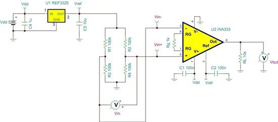 圖 2 是我用來展示焊劑污染所造成結果的測試電路。由 2.5V 參考電壓激活的平衡惠斯頓接橋網絡可仿真高阻抗橋接傳感器。差分橋接傳感器輸出 VIN - VIN- 可連接至增益為 101V/V 的 INA333。在理想狀態下,由于橋接處于平衡狀態,因而 VIN - VIN- = 0V。但焊劑污染會造成實際橋接傳感器電壓隨時間慢慢漂移。