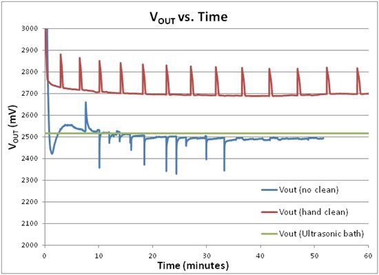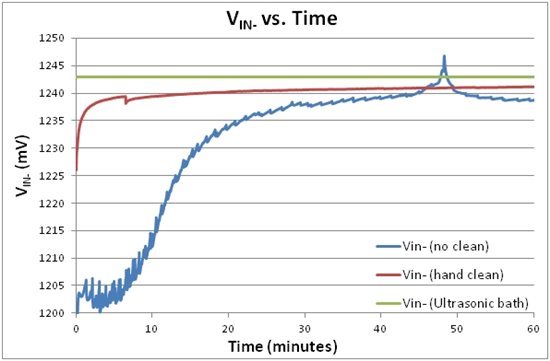 在本次測試中,裝配后我同時記錄了不同程度清潔之后 VIN- 和 VOUT 一小時的變動情況: