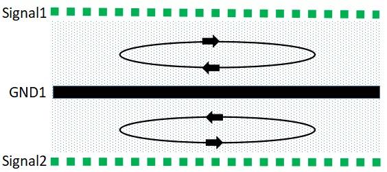 根據麥克斯韋方程,分立的帶電體或電流,它們之間的一切電的及磁的作用都是通過它們之間的中間區域傳遞的,不論中間區域是真空還是實體物質。在PCB中磁通總是在傳輸線中傳播的,如果射頻回流路徑平行靠近其相應的信號路徑,則回流路徑上的磁通與信號路徑上的磁通是方向相反的,這時它們相互疊加,則得到了通量對消的效果。