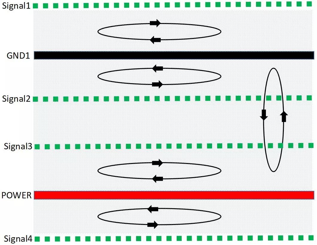 由于信號層與回流參考平面相鄰,S1、S2、S3相鄰地平面,有最佳的磁通抵消效果,優選布線層S2,其次S3、S1。