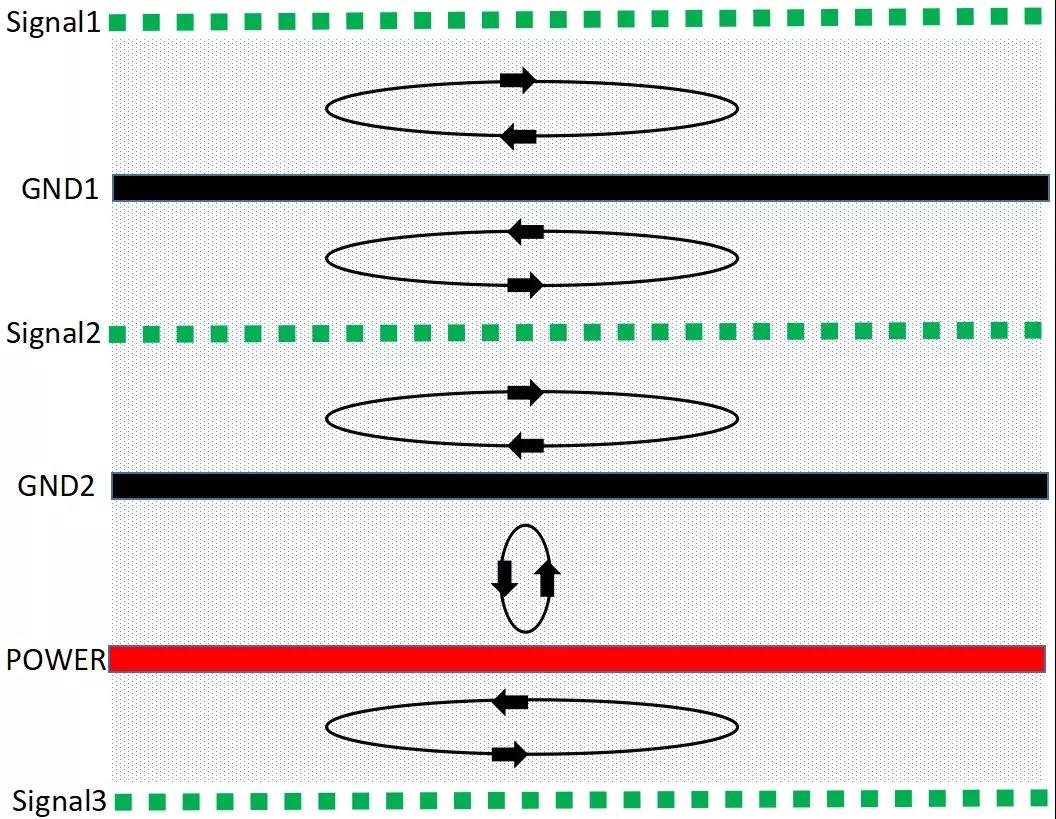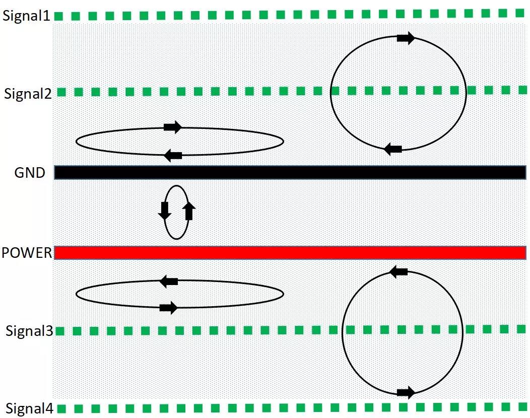 PCB疊層EMC規劃與設計思路的核心就是合理規劃信號回流路徑,盡可能減小信號從單板鏡像層的回流面積,使得磁通對消或最小化。