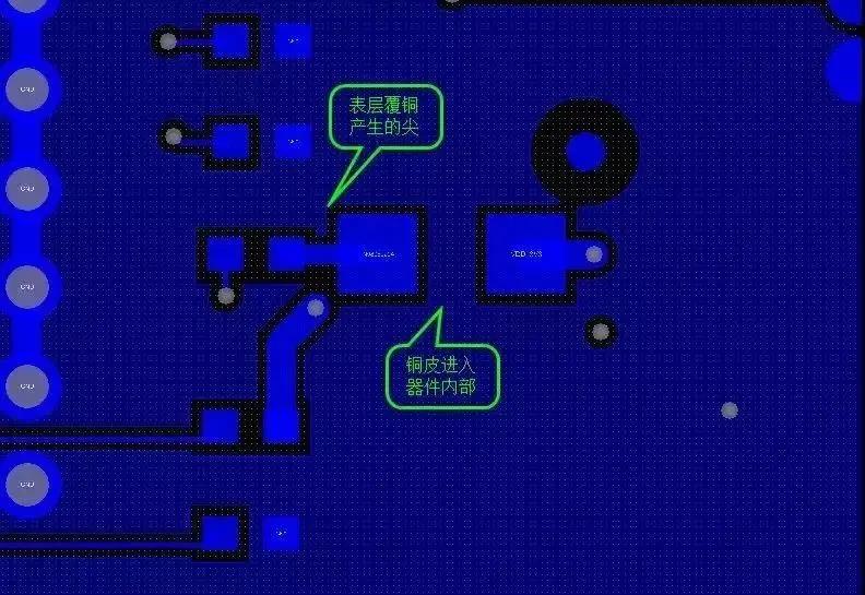 [3] PCB廠會盡量用覆銅替換覆銅+走線的模式,后者常常產生一些小尖角和直角使用覆銅替換走線: