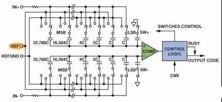 比較器將在每個時鐘邊緣比較電容器上的電壓與接地,以確定下一個電容器是否連接到電路。本質上,這是利用了數學分析上的二分法來逼近未知電壓。