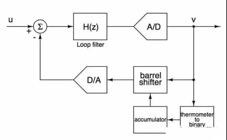 基本思想是快速遍歷DAC中的每一個電流元,從而減少電流元失配對ADC信噪比的影響,僅僅通過幾個簡單的數電模塊就可以實現對電流元失配的一階噪聲整形,非常巧妙。