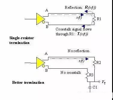 如下圖所示為兩種差分傳輸方式的終端方法,第一種方法采用單電阻終端,第二種方法采用雙電阻終端。