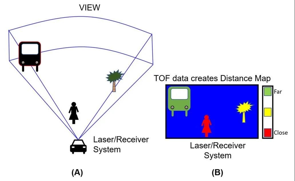 激光雷達系統的基本要素包括方波發射系統、目標環境,以及用來解釋環境中外部元素距離的光接收器系統。激光雷達傳感方法是采用脈沖激光形式的光,通過分析返回信號的飛行時間(ToF)來測量范圍的(圖2)。