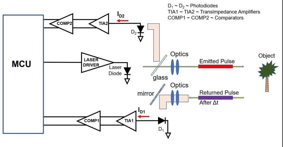 數字光信號脈沖射到對象后會反射回光學系統。返回的脈沖會鏡像到第二個光電二極管D1。D1信號路徑的電子部分與D2信號路徑相同。兩個信號到達微控制器(MCU)后即可計算出飛行時間。