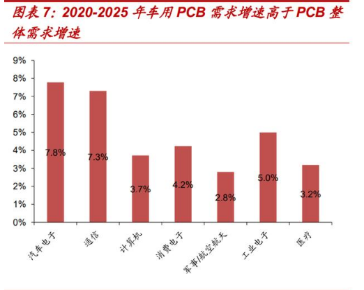 全球車用PCB 需求增速高于 PCB 整體需求。根據 Prismark 數據,車 用PCB需求將從2020年65億美元提升至2025年的95億美元,CAGR 為 7.6%,高于 PCB 整體增速 1.8pct,預計車用 PCB 占比將從 2020 年的 10%提升至 2025 年將為 11%。