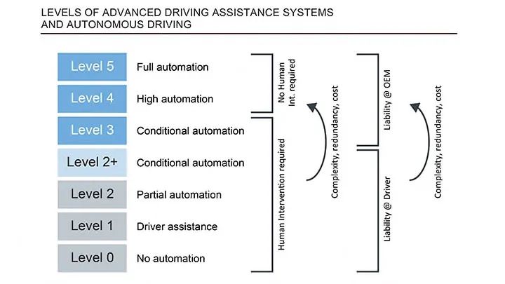 L3自動駕駛汽車的事故責任主要由汽車廠商而非駕駛員承擔。汽車廠商在努力解決滿足L3等級的設計復雜性問題,而同時,人們的注意力已經轉向過渡性等級,并推進了它的發展進程。在傳感器技術方面,從L2到L3存在顯著差異。L2+的功能與L3類似,供駕駛員作為備份選擇,減少了額外的冗余需求。