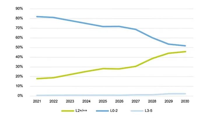 圖2:從L2+級向自動駕駛轉變的市場預測(2021-2030)