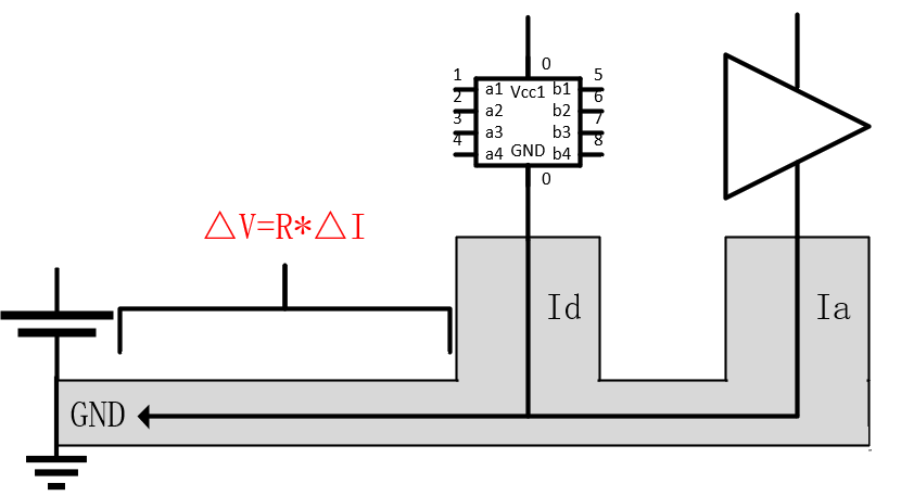 上圖是一種地線走線示意圖,數字電路和模擬電路的GND最終都要匯聚一起和電池的地連接。也就是說,數字電流Id和模擬電流Ia最終都要匯集在一起,那么這兩路電流Id和Ia就用公用地線部分,如上圖括號內所示。
