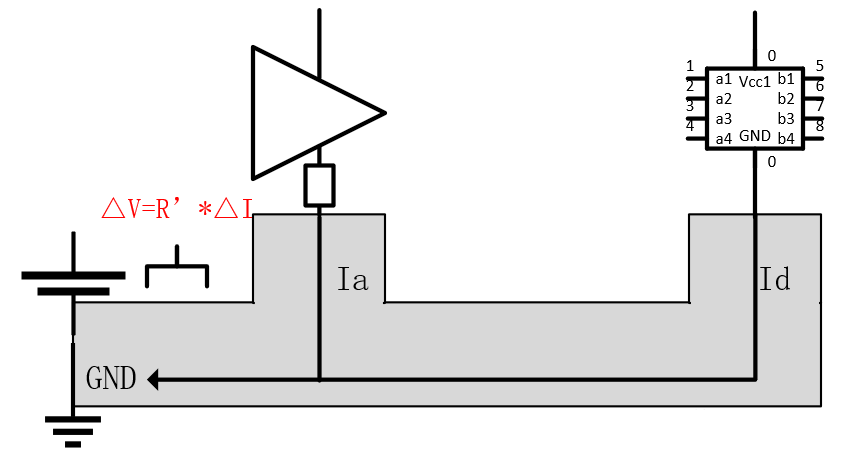 一般而言,數字電流Id的波動是比較大的,而模擬電流Ia的波動略小。數字電Id的波動在共用地線部分會引起電壓波動,這個波動就會被模擬電路感應到,進而引起信號質量下降,比如共用地部分的電阻是20 mΩ,而數字電流Id波動是1A,那么引起的電壓波動△V就是0.02*1=0.02V。這個20mV被模擬電路的放大器感應到,將會以噪聲形式出現,這就是地線阻抗大的后果。