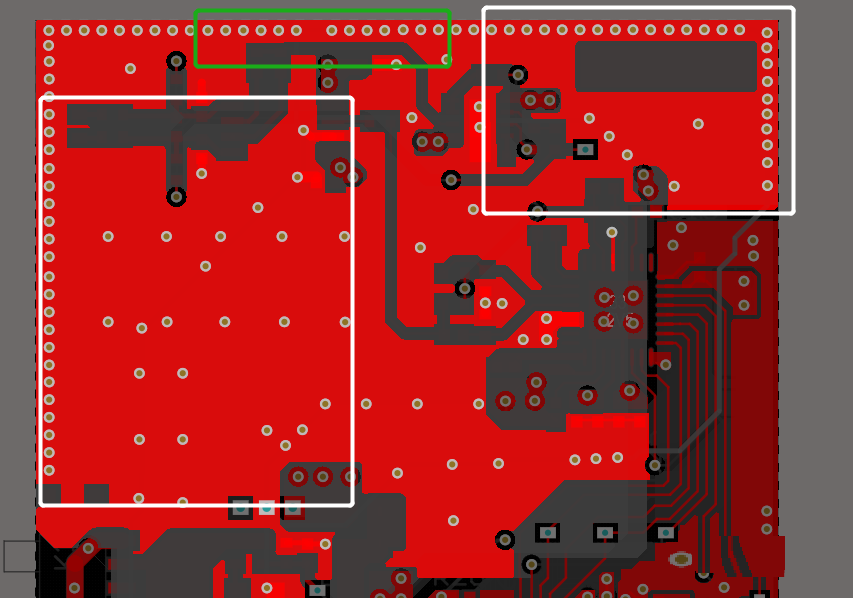 比如下圖高亮的紅色銅皮,兩塊白色方框內的銅皮看起來很大,其實他們的連接僅僅只有綠色部分窄窄的一條,這里就是阻抗瓶頸。