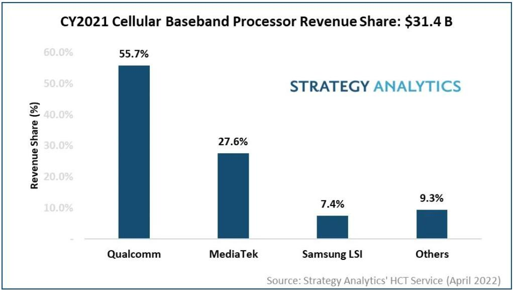 高通、聯發科、三星LSI、紫光展銳和英特爾占據了2021年基帶芯片市場收益份額的前五名。