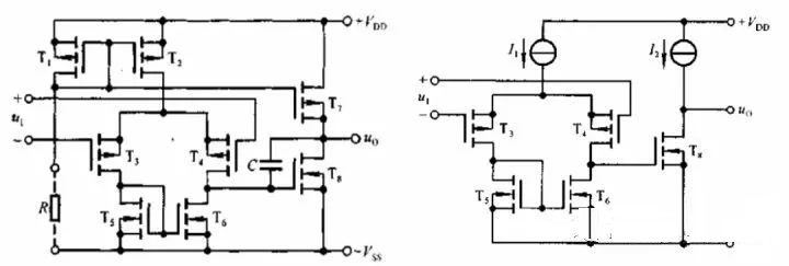 第一級是以 P 溝道管T3和T4為放大管、以 N 溝道管T5和T6管構(gòu)成的電流源為有源負(fù)載,采用共源形式的雙端輸入、單端輸出差分放大電路。由于第二級電路從T8 的柵極輸入,其輸入電阻非常大,所以使第一級具有很強的電壓放大能力。