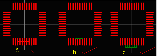 下圖a的短接方法不利于工人識別該管腳是否應該相連,且焊接后不美觀。如果畫圖時按圖b、圖c的方法短接并加上阻焊,焊接出來的效果就不一樣:只要保證每個管腳都不相連,該芯片就無短路現象,而且外觀也美觀。