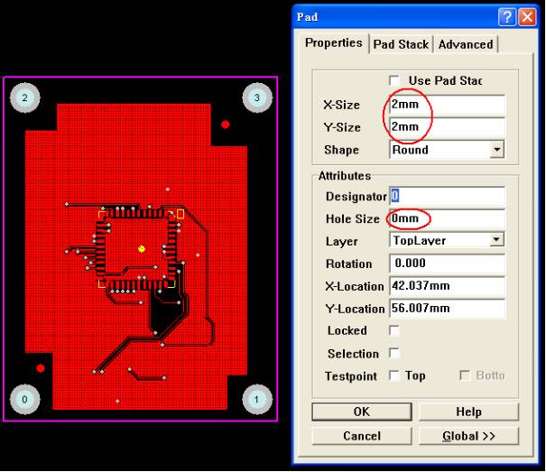 由于BGA封裝比較特殊,其焊盤都在芯片底下,外面看不到焊接效果。為了返修方便,建議在電路板上打兩個 Hole Size:30mil 的定位孔,以便返修時定位(用來刮錫膏的)鋼網。
