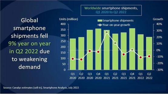 據深聯電路指紋識別軟硬結合板小編了解,根據Canalys發布的新數據顯示,2022年二季度全球智能手機出貨量同比下降9%,跌破3億臺,手機出貨量已經連續兩個季度下降。